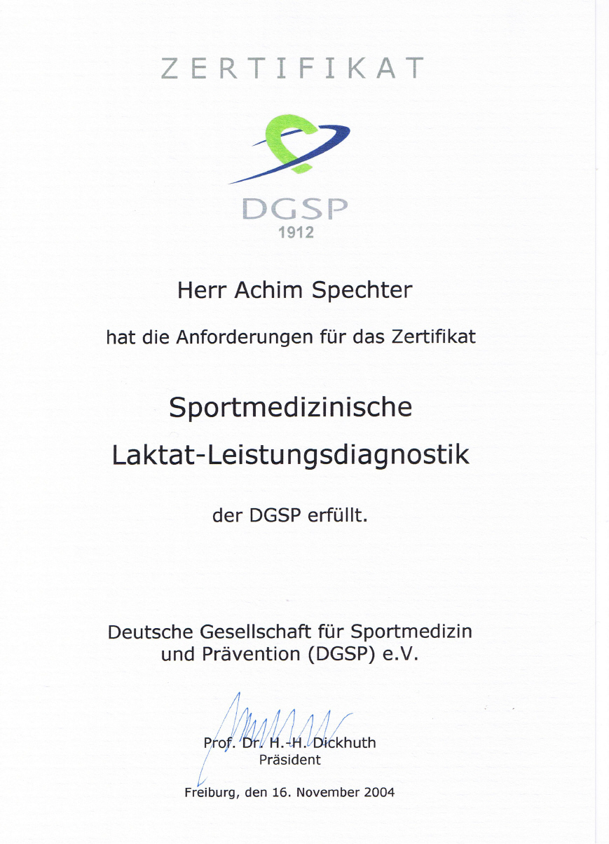 Die in unserer Praxis durchgeführte sportmedizinische Laktat-Leistungsdiagnostik (Laktattest) ist durch die Deutsche Gesellschaft für Sportmedizin und Prävention (DGSP)zertifiziert.